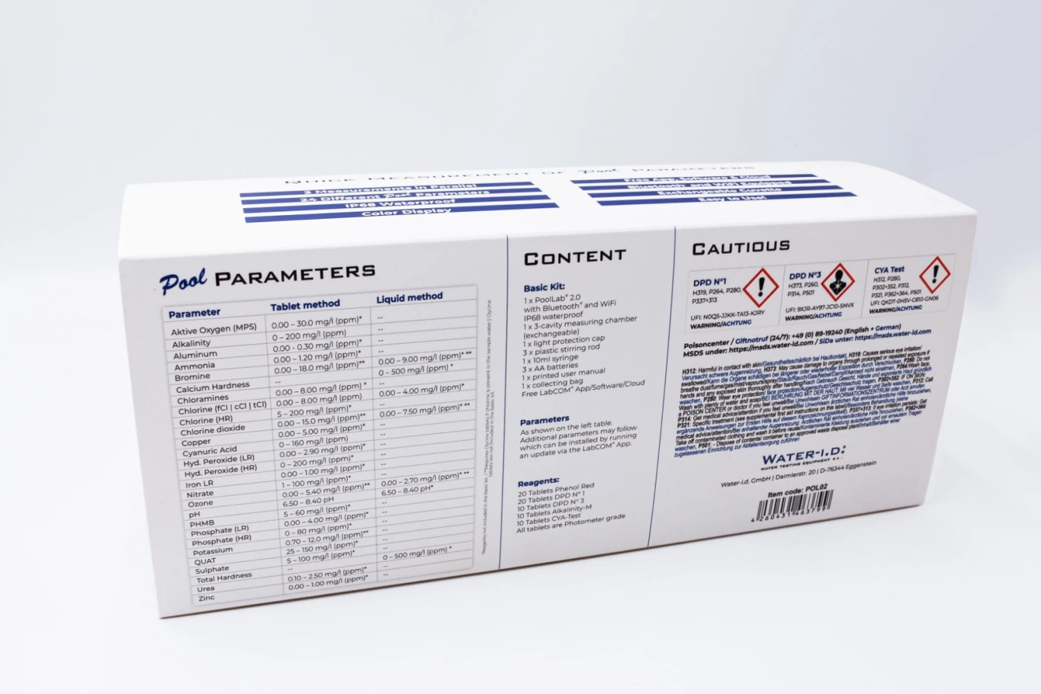 - 1 x Pool Lab® 2.0 Photometer with Bluetooth and wiFi IP68 Waterproof